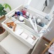 - メイク・ヘアセットもしやすいW35×H25cmのミラー。1500Wの2口コンセント付なので、ドライヤー・ヘアアイロンの使用にも対応。天板には強化ガラスを使用。天板を閉じるとフラットになる為、ワーキングデスクとしても使用できる賢いドレッサーです。アクセサリー等の小物に便利な引出収納。スツールの座面下には大容量の収納スペース。ドライヤー・ヘアアイロン・高さのあるスプレー缶等もしっかりと収納。