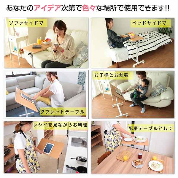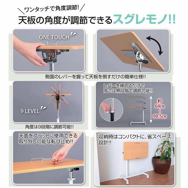 - ベッドに差し込んでベッドテーブルとして。ソファに差し込めばサイドテーブルとして飲み物や雑誌を置くのに便利。タブレットやノートパソコンの使用時にとっても便利。角度を調整してタブレットや料理本を立てて、広げて置けるので、キッチンでも大活躍。 キャスター付きなので、移動がラクラク。好きな場所で使えます。収納時は折りたたんでコンパクトに。テーブルの角度は使うシーンに合わせて9段階に調節可能。角度調整は片手でレバーを握るだけ!高さは約64〜98.5cmまで、無段階に高さが調節できるので、使いたい高さに。ダイニングで補助テーブルとして。