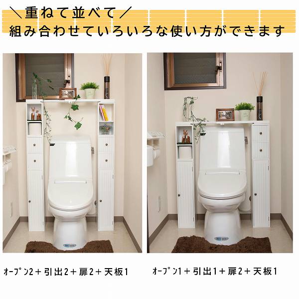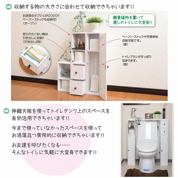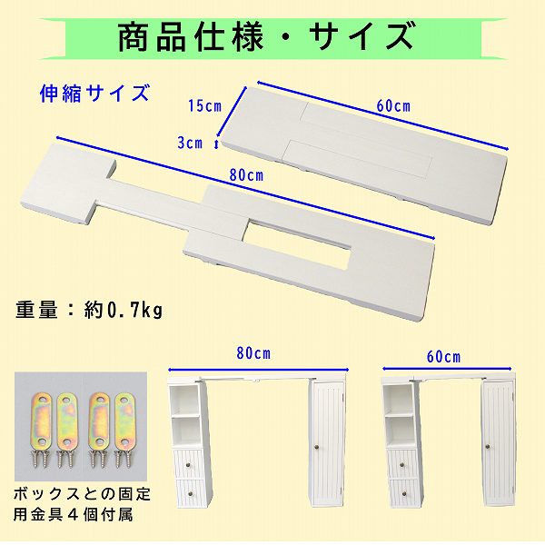 トイレタンクの上のスペースを有効活用できる伸縮式天板。ボックスをトイレの両サイドに設置し伸縮天板をまたがせて設置すればお洒落な飾り棚ができます。幅は60cm〜80cmまで伸縮できます。