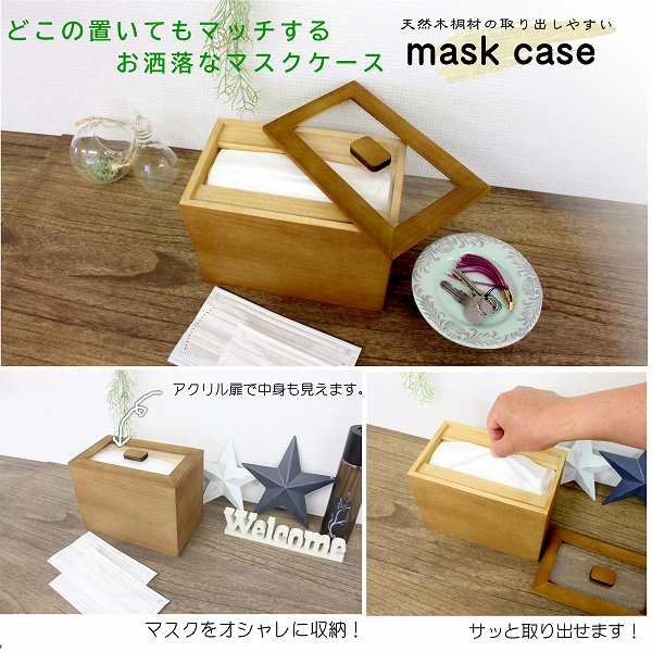 マスクケース 約幅20cm ブラウン 木製 桐材 取り出しやすい バネ式 リフトアップ構造 完成品 プレゼント ギフト 贈り物