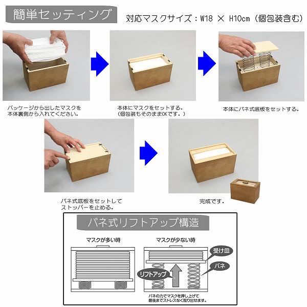 - バネ式リフトアップ構造でいつでもマスクが上にあり取り出しやすいです。中身も見え、玄関に置いてもオシャレに収納できます。