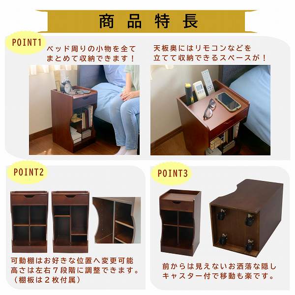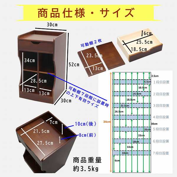 - 可動棚板はお好きな位置へ変更可能。高さは7段階に調整できます。移動が楽な隠しキャスター付!