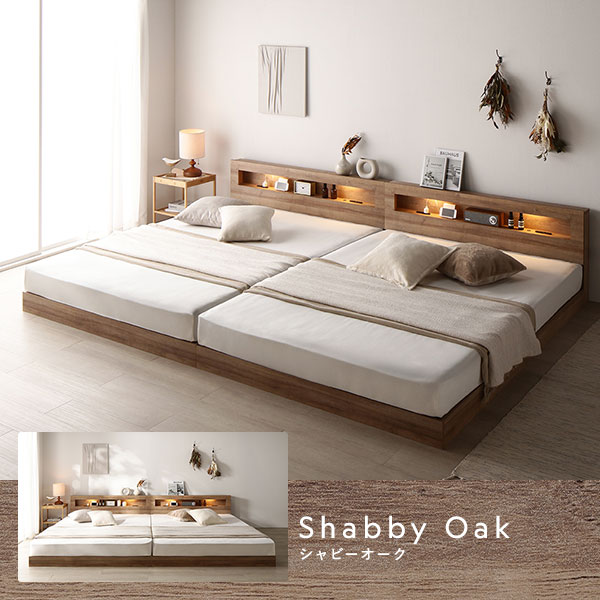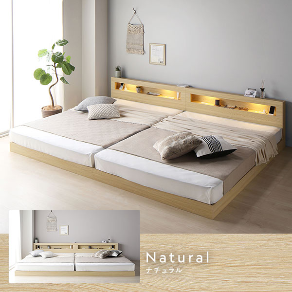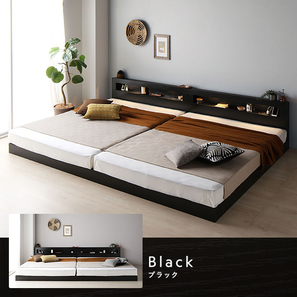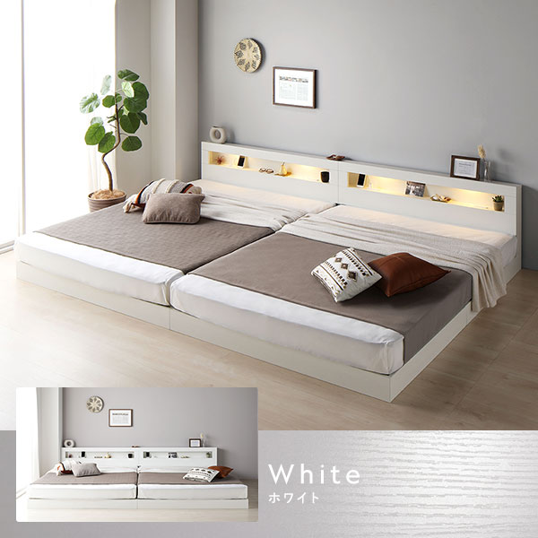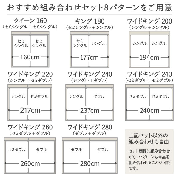 ・クイーン・キング・ワイドキングのベッドフレームには、それぞれ2台ずつマットレスがセットされています。2台を並べてご使用ください。