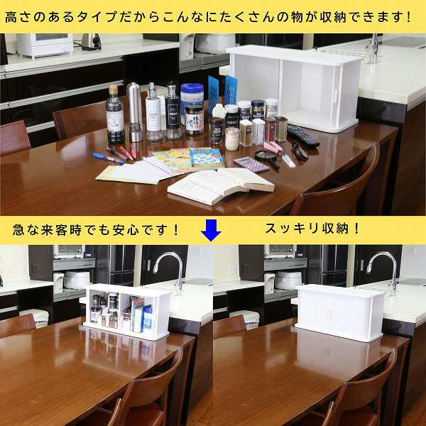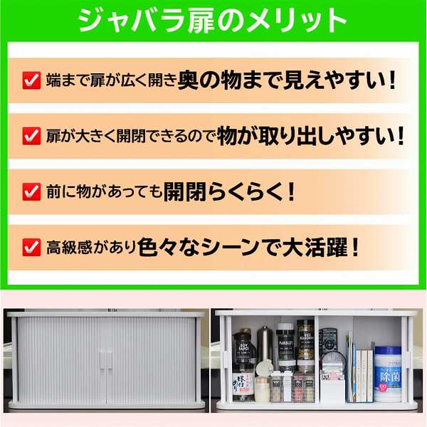 - ジャバラ式の扉なので、扉を開けても場所をとりません。カウンター上やダイニングテーブルの上に置いても使い勝手が良く、中身も良く見えます。収納した調味料や小物の取り出しがラクラク!落ち着いた雰囲気で、キッチンにマッチするオシャレな収納庫です。