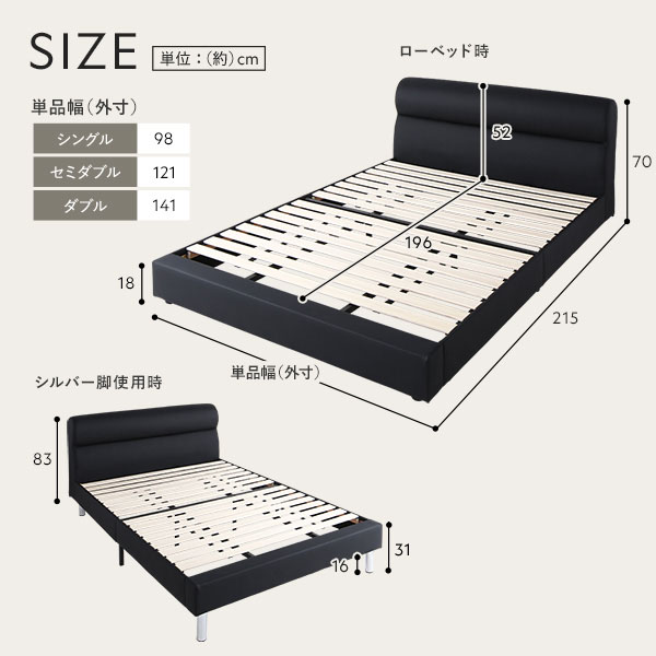 セミダブル:幅121×奥行215×高さ83cm(ローベッド時:70cm)