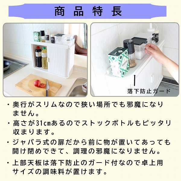 - 日頃使わない背の高いストックボトルも収納できます。上部天板はガード付で良く使う調味料の置き場にも!