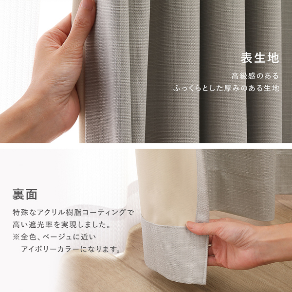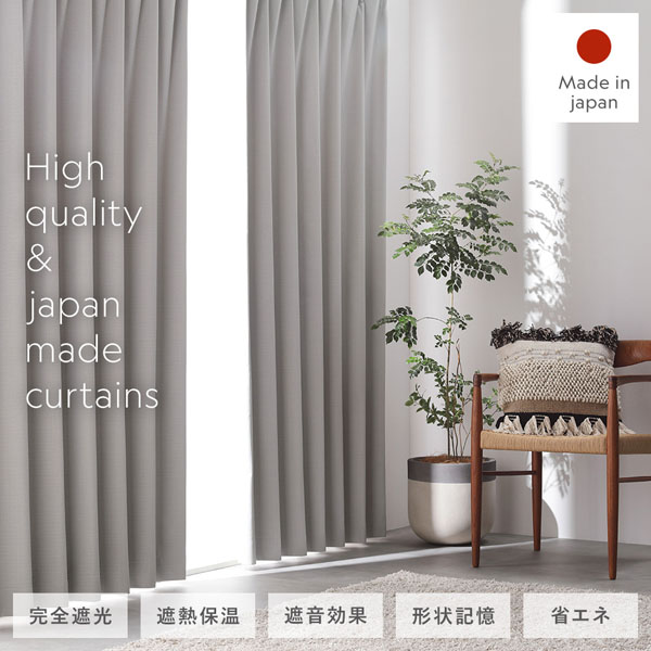 1級遮光(遮熱効果率:41.1%、保温効果率:34.3%)、1.5倍ヒダ、防音、形状記憶、ウォッシャブル