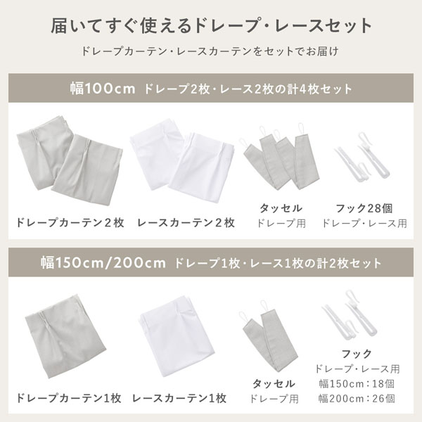 幅150cm・幅200cm:ドレープ・レースカーテン各1枚入り(計2枚セット)