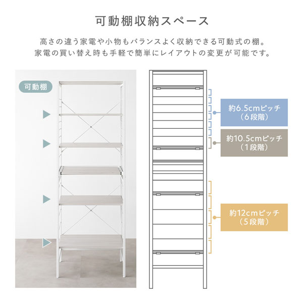 細かいピッチ設定で、小物から大物家電まで効率よく収納可能。