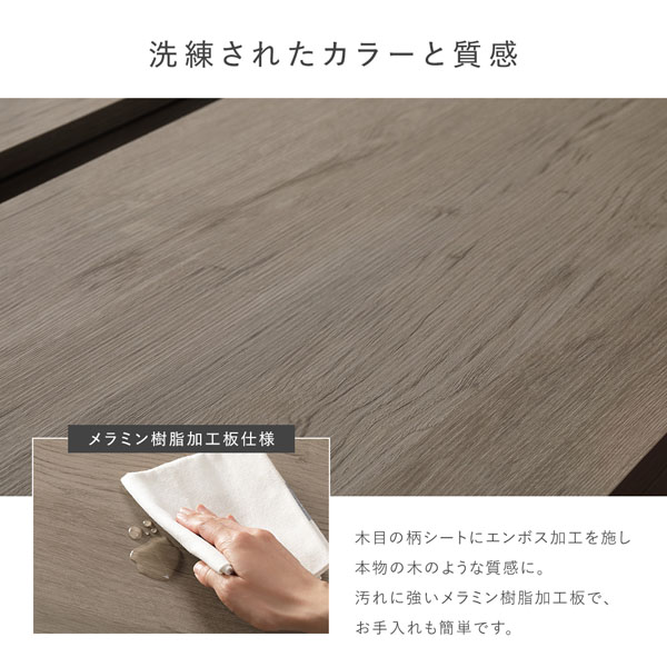 汚れに強いメラミン樹脂加工板で、お手入れも簡単です。