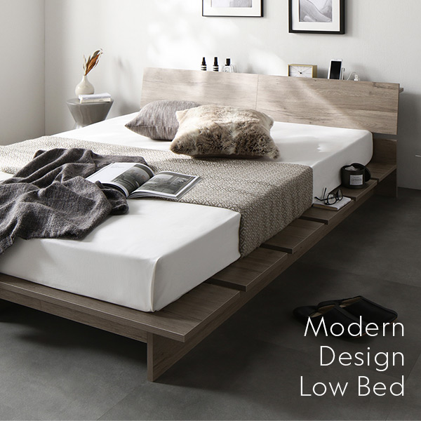 ローベッド 棚付 ステージタイプ セミダブル 幅140cm 3ゾーンポケットコイルマットレス付 ストーングレー ステージベッド