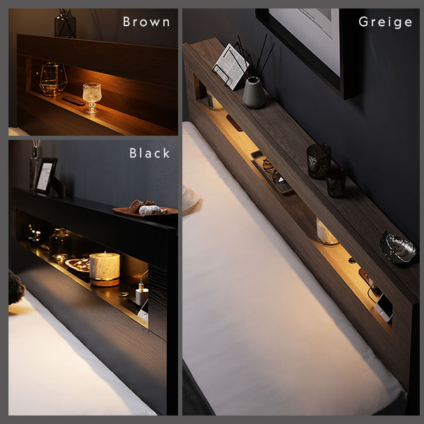 セミダブル・ダブル・クイーンサイズは左右両側に2灯、シングルサイズは真ん中に1灯のLED照明付き