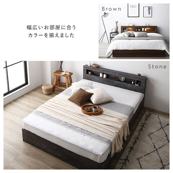 ベッド クイーン 3ゾーンポケットコイルマットレス付き ストーングレー 照明 宮付 収納ベッド
