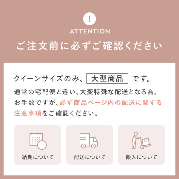 ・クイーンサイズは大型商品の配送となります。通常の宅配便とは異なりますので、必ず以下の注意事項をご確認ください。
