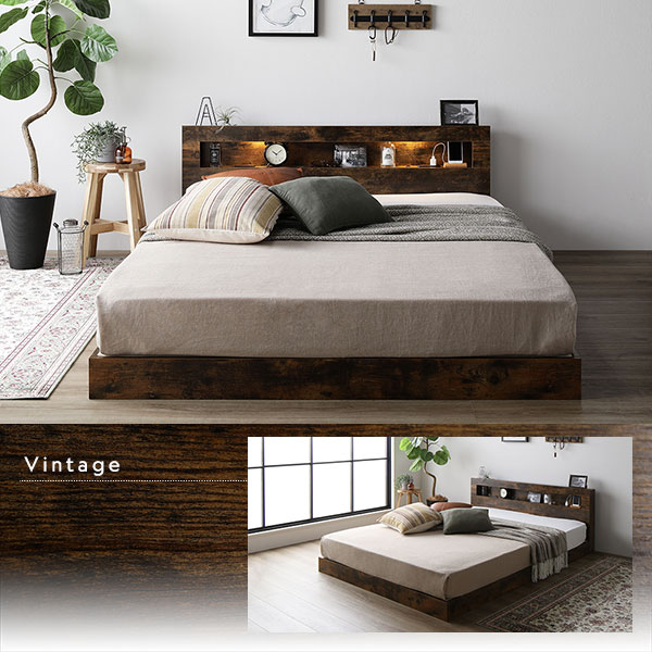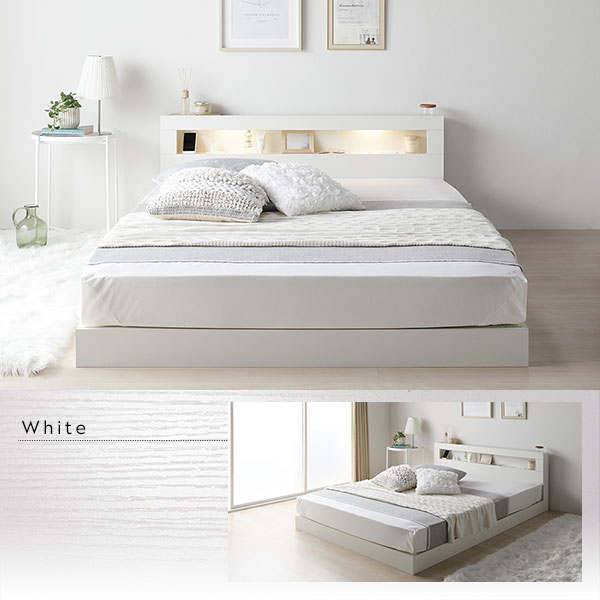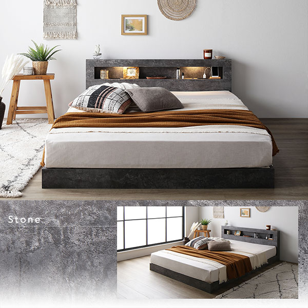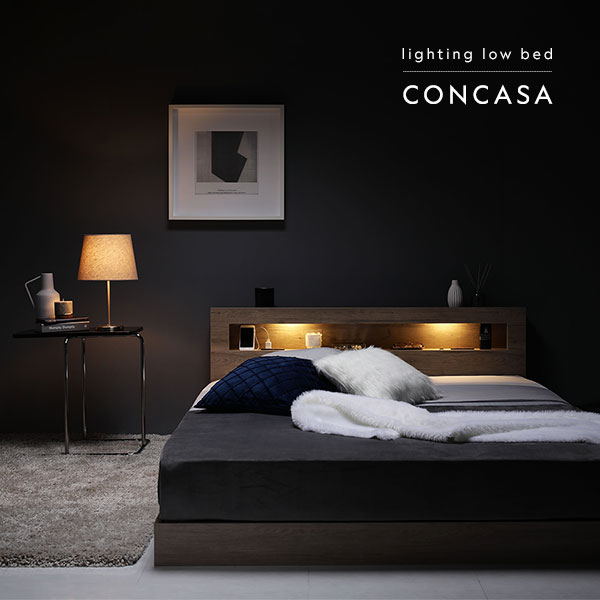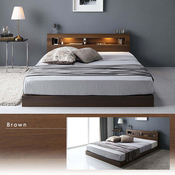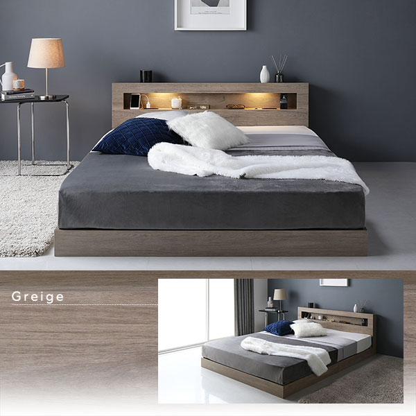 ベッド クイーン 3ゾーンポケットコイルマットレス付 グレージュ 低床 照明 宮付 すのこ