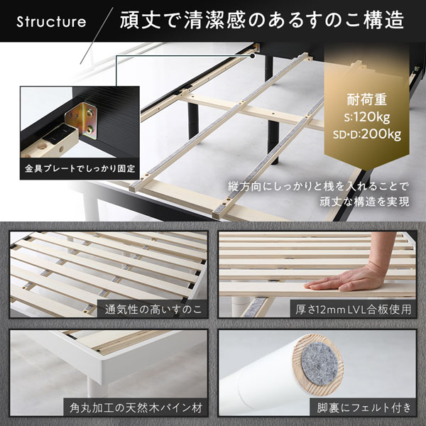 ベッドフレームには必ずボンネルコイルマットレス・ポケットコイルマットレスを乗せてご使用ください。